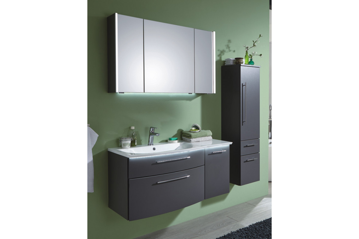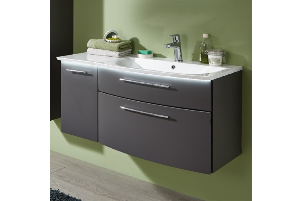 Подвесной комплект мебели для ванной, шириной 100 см.Данная коллекция исполнена в четырех размерах: 70 см, 100 см, 130 см, 170 см. Восемь цветов фасада, девять цветов корпуса. Мебель выполнена из влагостойкой МДФ, раковина из литьевого мрамора.