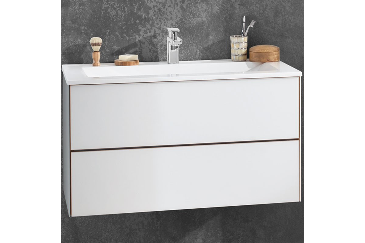 Подвесной комплект мебели для ванной, шириной 90 см оборудована двумя выдвижными ящиками и системой открытия/закрытия.