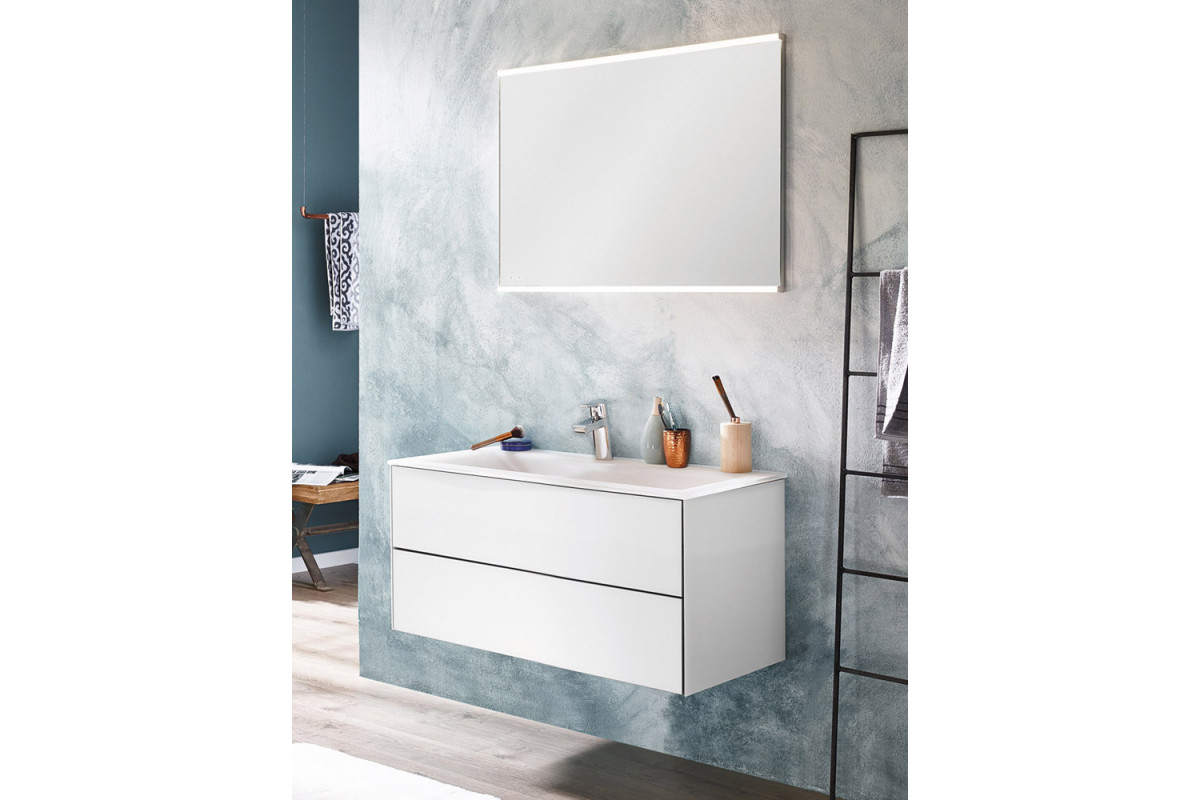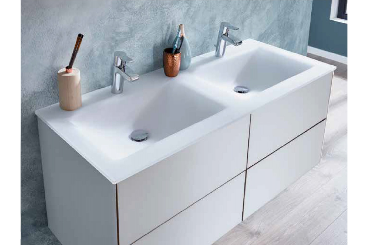 Подвесной комплект мебели для ванной, шириной 120 см оборудована двумя выдвижными ящиками и системой открытия/закрытия.