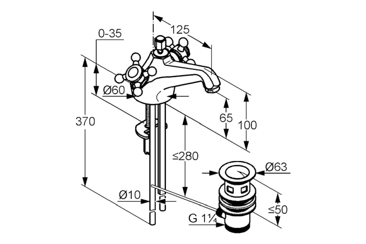 Излив длина 125 мм, высота 65 мм