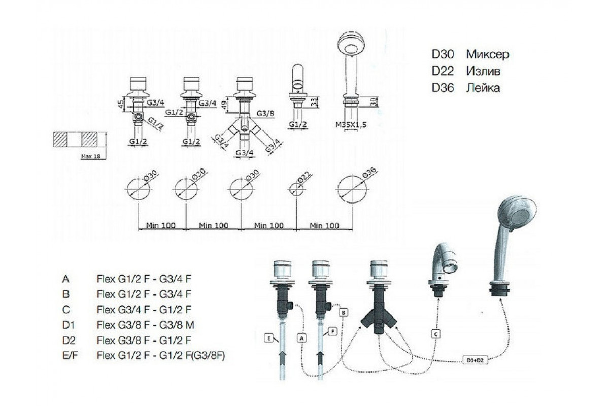 Смеситель на борт ванны, состоит из трёх элементов:1. Излив с девиатором2. Миксер3. Лейка..